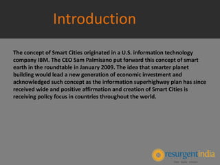 The document discusses the concept of smart cities, originating from IBM's idea of a 'smart earth,' emphasizing the need for urban areas to adapt to the accelerating migration from rural to urban settings, particularly in India. It describes smart cities as regions enhanced by ICT for sustainable development, covering aspects such as governance, citizen engagement, energy management, and infrastructure. The text highlights the role of technology in addressing urban challenges and improving citizens' quality of life.