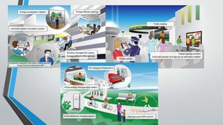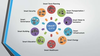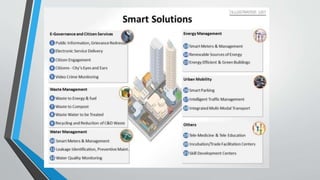Smart cities aim to use information and communication technologies to improve efficiency and sustainability in urban areas while reducing costs. Sensors around the city monitor various factors and transmit data to authorities to facilitate better planning. Technologies used include CCTV, traffic sensors, and crime prediction software. At the proposed GIFT City in Gujarat, a smart waste management system uses underground pipes and plasma incineration to efficiently dispose of waste and generate power. The smart city development models include retrofitting existing areas, redeveloping areas over 50 acres, and greenfield development on over 250 acres of vacant land.