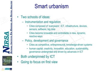 This document discusses the rise of smart cities and big data. It outlines two views of smart urbanism: instrumentation and regulation of cities through ubiquitous sensors and data collection, and using technology to make cities more competitive, innovative and sustainable. The focus is on how cities are becoming composed of networks of instruments and data that aim to make urban systems knowable and controllable in real-time. While big data promises benefits like improved services and governance, it also enables more extensive surveillance and raises issues around privacy, technocratic governance, corporate influence, and hackability of urban systems. Critical examination is needed to ensure smart city development aligns with citizens' values and addresses structural problems, not just technical solutions.