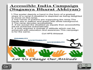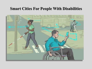 This document discusses considerations for ensuring infrastructure in smart cities is accessible to people with disabilities. It notes that around 15% of the world's population lives with a disability, and accessibility must be considered in planning smart cities. Universal design principles that make infrastructure usable by all are recommended, such as accessible transportation, buildings, information and communication technologies. Involving people with disabilities in the planning and design process is key to creating inclusive infrastructure.