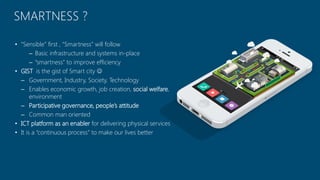 The document discusses the creation of smart cities in India, emphasizing the importance of basic infrastructure as a precursor to smartness. It highlights the role of ICT as an enabler for service delivery, the need for a strong policy framework, and the potential for innovation and skill development within the IT industry. Key components include participative governance, improved accountability, and a focus on local solutions to enhance urban living.
