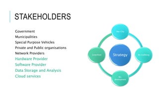 The document outlines the implementation of smart city solutions involving various stakeholders such as government, municipalities, and private organizations. It discusses the use of technology in infrastructure management, utilities, agriculture, and healthcare to enhance efficiency, reduce response times, and improve the quality of life for citizens while addressing environmental concerns. Emphasis is placed on data security, privacy, and the need for collaborative efforts to achieve successful smart city initiatives.