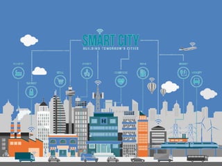 Dokumen ini membahas konsep smart city dan smart village, di mana smart city didefinisikan sebagai penggunaan teknologi untuk mengintegrasikan layanan kota secara efisien, sedangkan smart village merupakan penerapan konsep serupa pada skala lebih kecil dengan fokus pada peningkatan layanan pemerintahan dan kesejahteraan masyarakat desa. Terdapat enam indikator utama untuk smart city, termasuk ekonomi, pemerintahan, dan mobilitas, serta rincian tentang implementasi di kota Bandung. Selain itu, smart village dijelaskan sebagai solusi untuk permasalahan desa, mendorong partisipasi masyarakat dan pengembangan ekonomi berbasis teknologi.