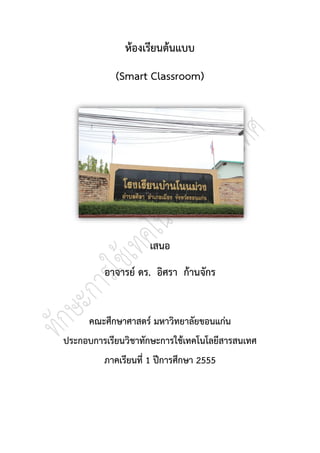 จัดทำขึ้นเพื่อประกอบการเรียนวิชา ทักษะการใช้เทคโนโลยีสารสนเทศ เนื้อหาเกี่ยวกับการออกแบบห้องเรียนต้นแบบ(Smart Classroom) ซึ่งเราได้ทำการออกแบบห้องปฏิบัติการวิทยาศาสตร์ของโรงเรียนบ้านโนนม่วง และหลักการและเหตุผลในการออกแบบ รวมถึงกระบวนการที่ทำให้สามารถพัฒนา Literacy ของผู้เรียน