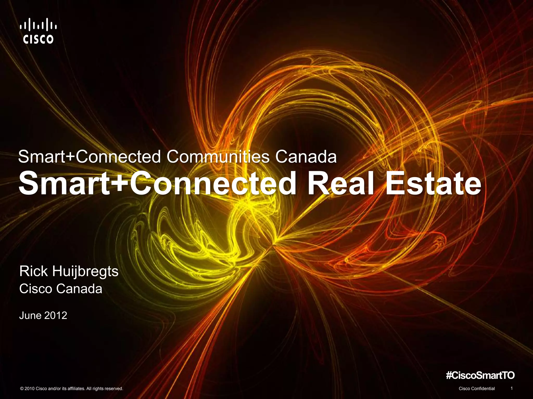 The document discusses the state of commercial real estate and construction in Canada, highlighting a significant amount of existing space and annual spending in the sector. It emphasizes Cisco's role in smart and connected buildings through advanced technology and energy management systems aimed at improving efficiency and sustainability. Key benefits include operational and capital expenditure savings while enhancing employee productivity and environmental quality.