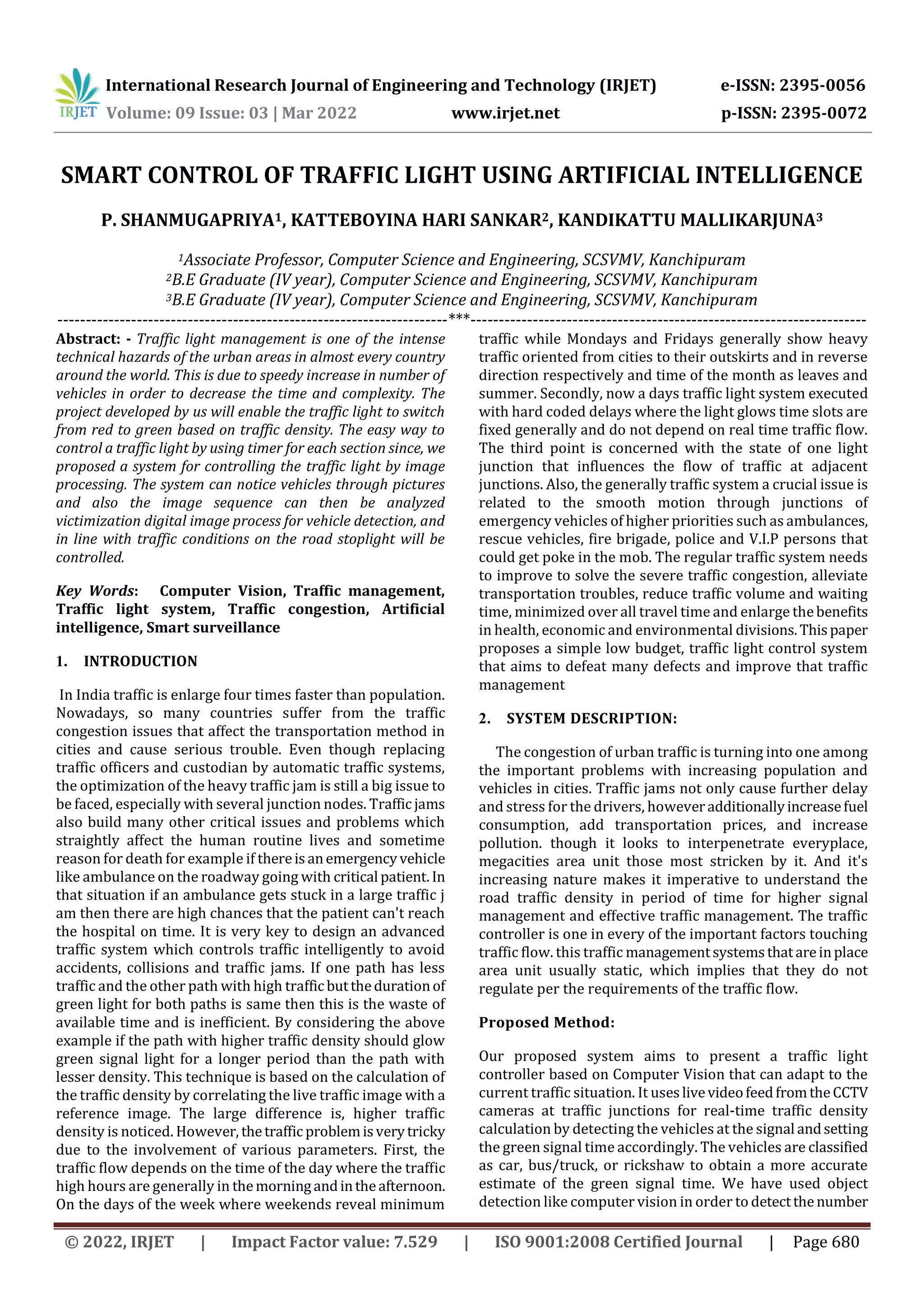 This document discusses a proposed smart traffic light control system using artificial intelligence. It aims to reduce traffic congestion by dynamically adjusting traffic light timings based on real-time traffic conditions detected through image processing of CCTV footage, rather than fixed timings. Vehicles will be detected and classified, and green light times for each direction at an intersection will be determined by the current vehicle density. This is intended to optimize traffic flow and reduce delays. The system will be implemented using computer vision libraries in .NET Framework and data will be stored in SQL Server.