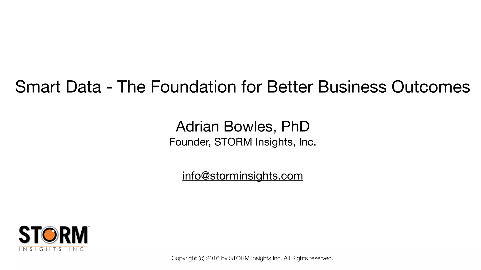 The document outlines four major themes related to smart data and its impact on business, including cognitive computing, the Internet of Things (IoT), smart data management, and transforming business with smart data. It discusses the importance of predictive analytics, the emergence of new business models, and the integration of cognitive systems to enhance data utilization in various sectors. Additionally, it highlights upcoming webinars focused on the practical application of these themes in modern business environments.
