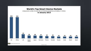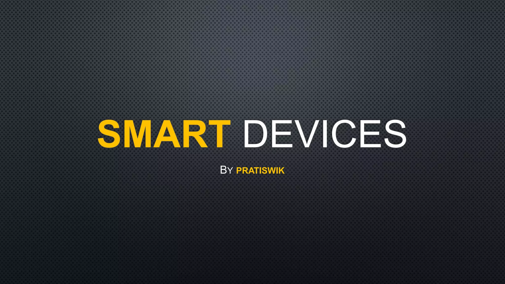 This document discusses different types of smart devices. It defines smart devices as those that connect to the internet and other devices wirelessly, can be portable, process and store data, and can perform some tasks autonomously. Examples of smart devices given include smartphones, tablets, smart watches, smart glasses, and smart wristbands. Each type of smart device is then described in more detail, outlining their general functions and properties. Both advantages like improved communication and endless applications, and disadvantages like higher costs and security issues of smart devices are mentioned.