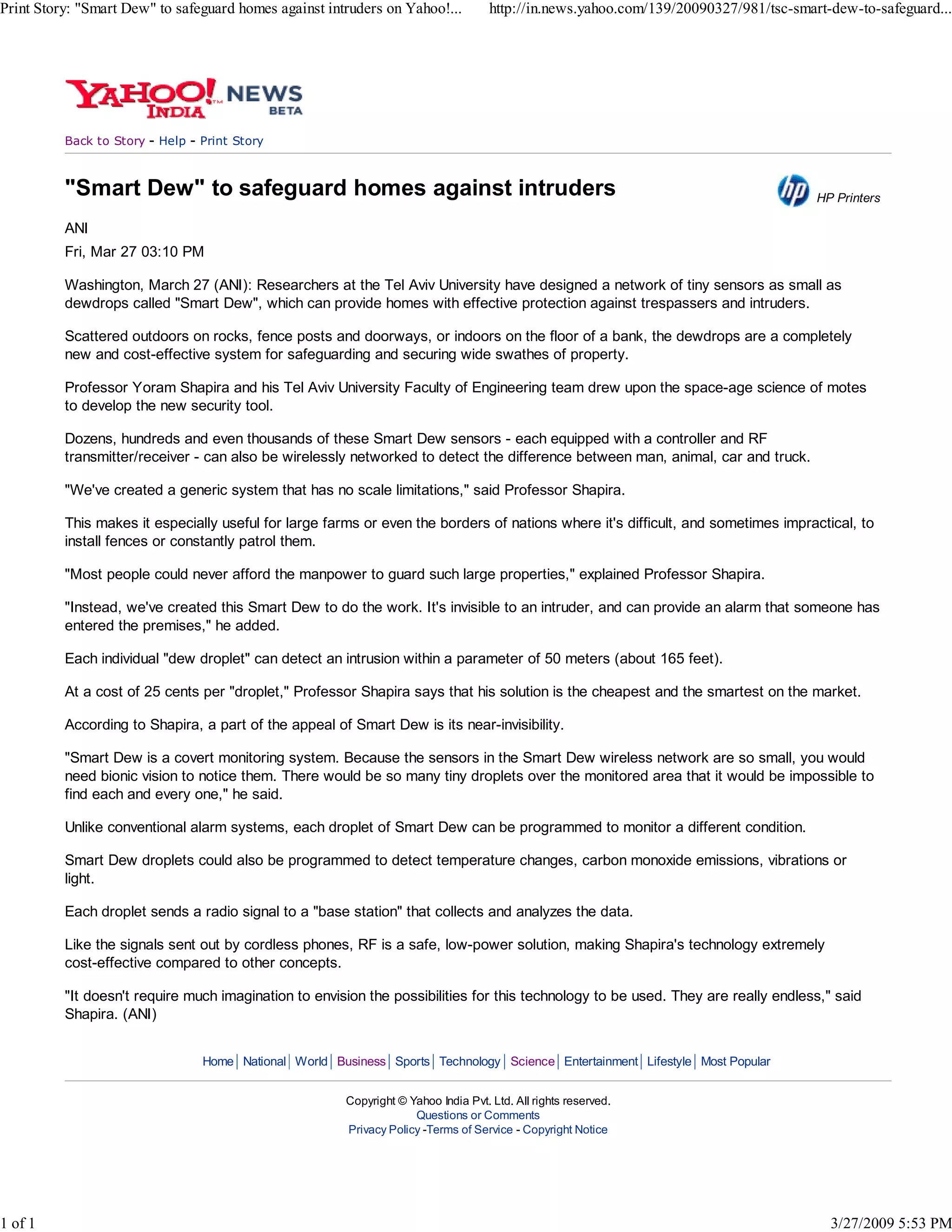 Researchers at Tel Aviv University have developed a new security system called "Smart Dew" that consists of tiny wireless sensors, each the size of a dewdrop, that can be scattered outdoors or indoors to detect intruders over wide areas in a nearly invisible and cost-effective way. The Smart Dew sensors communicate wirelessly to detect people, vehicles, and other objects, and can be programmed to monitor different conditions like temperature or vibrations to provide security for properties like farms or national borders that would be difficult to guard otherwise. Each sensor costs 25 cents and together they form a covert monitoring network that would be nearly impossible for an intruder to notice or disable.