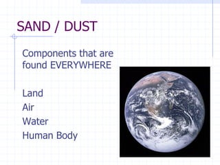 Smart dust is a technology involving nano-scale sensors and electronics embedded in dust-sized devices that can detect things like temperature, light, and movement. The devices communicate wirelessly and are very inexpensive to produce, costing around $0.62 each. Potential applications include environmental monitoring, habitat monitoring of animals, military surveillance, medical uses such as detecting damaged cells, and more. The technology was first conceived in the 1990s and continues to progress with potential to gather various types of data.