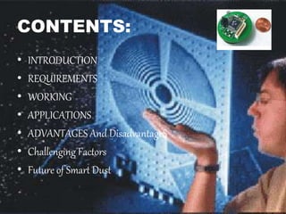 Smart dust is a network of tiny sensor motes that can detect environmental conditions like light and vibrations. Each mote contains sensors and computational ability to communicate wirelessly with other motes or a base station. Though constrained by their small size, the motes conserve power by powering on intermittently to perform tasks then powering off. Potential applications include environmental monitoring and situations where wired sensors are impractical. While smart dust enables connectivity and low costs, privacy concerns and challenges around power management and self-maintenance exist. However, companies are investing in the technology to integrate it into future systems and networks.