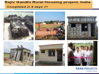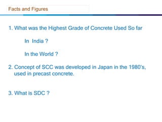 Tata Projects Limited introduces Smart Dynamic Concrete (SDC), an innovative concrete solution that eliminates the need for vibration during placement, allowing it to flow and compact under its own weight, thus facilitating faster construction. SDC offers improved homogeneity and strength with reduced water-cement ratios while addressing market challenges such as construction speed and managing skilled labor. The document outlines the specifications, benefits, and value propositions of SDC in the context of contemporary concrete technology and construction requirements.