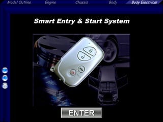 1. The document describes the components and operation of a smart entry and start system used in Toyota vehicles. It details the key fob, antenna locations, control modules and circuits involved in remote locking, unlocking, engine starting and other functions.