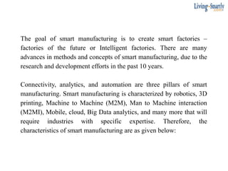 Smart manufacturing aims to develop intelligent factories utilizing connectivity, analytics, and automation as its core pillars. It encompasses technologies such as robotics, IoT, and cyber-physical systems to enhance operational efficiency and adaptability in various industries. The future of smart manufacturing includes increased automation, use of AI, and a focus on sustainability, which can lead to significant profitability for businesses.