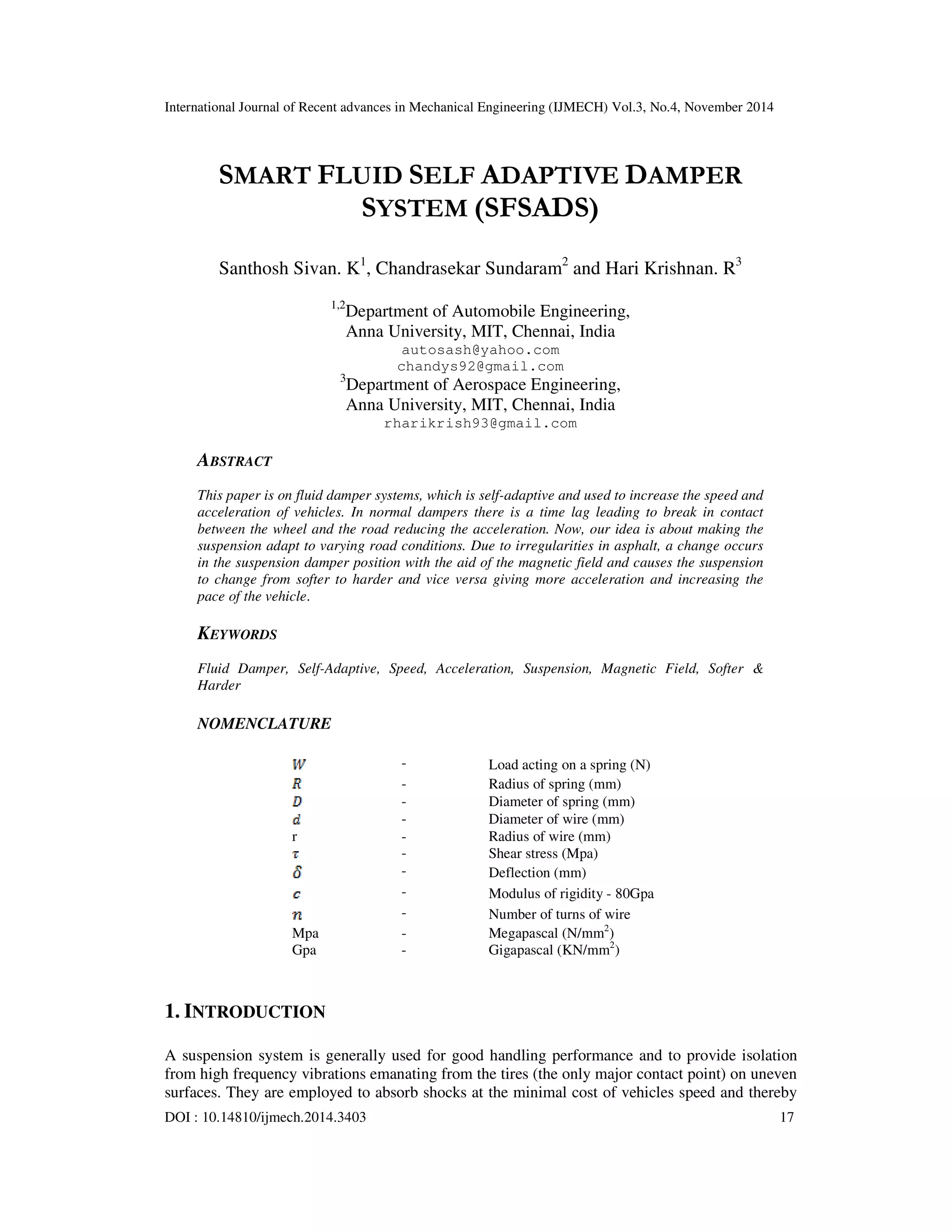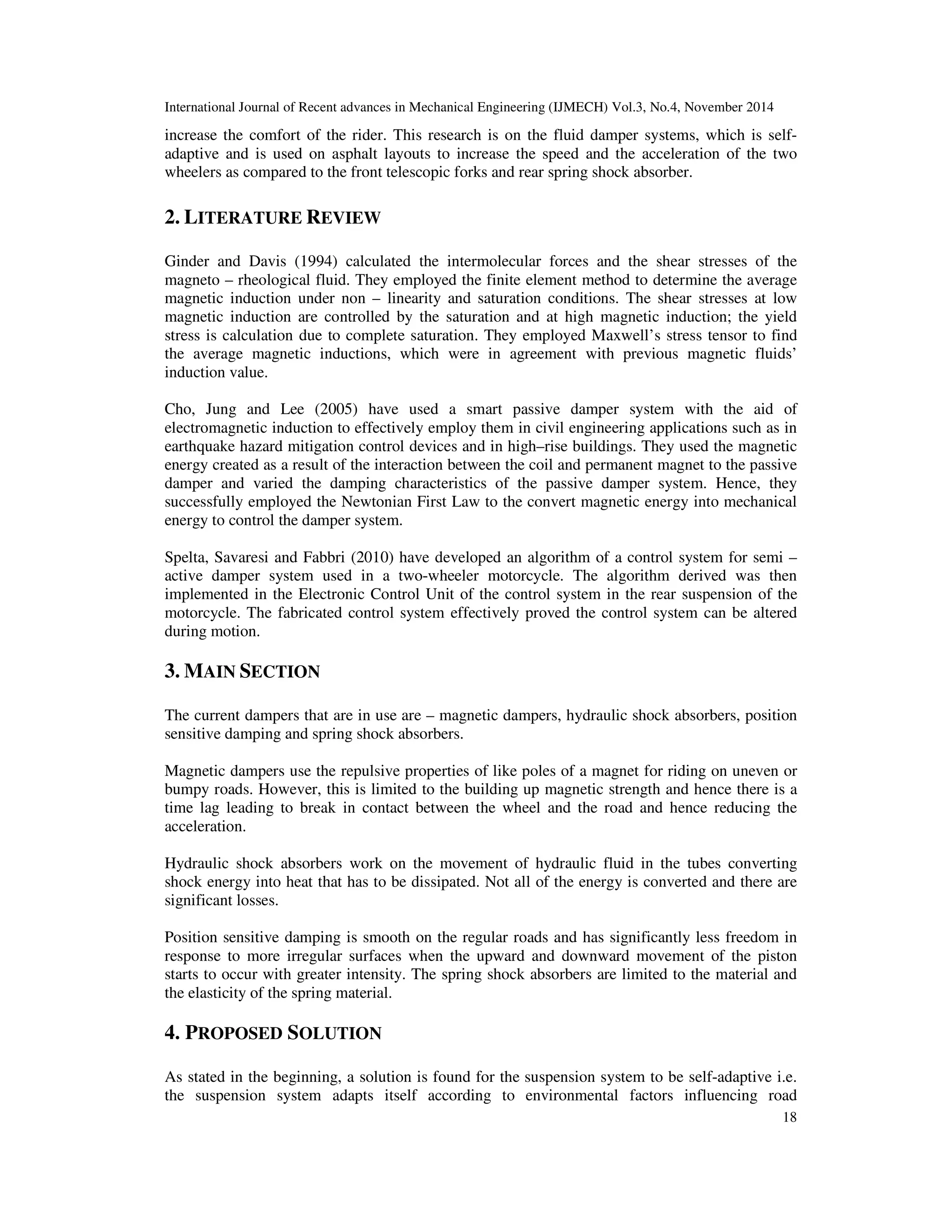The document discusses the development of a Smart Fluid Self Adaptive Damper System (SFSADS) designed to improve vehicle speed and acceleration by adapting to varying road conditions using magneto-rheological fluid. It details the limitations of current dampers and presents a solution that enables the suspension system to change stiffness in response to environmental factors, ultimately enhancing vehicle performance. The proposed system is analyzed through simulations, demonstrating its effectiveness in increasing cornering stability and handling during irregular road conditions.