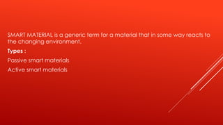 Smart materials can be passive or active and react to their environment. To make conductive fibers for smart garments, fibers can be coated with conductive materials like carbon or polymers, or spun with thin metallic or plastic threads. Metallic threads are very thin metal filaments produced through bundle drawing or metal sheet shaving that can be used as electrodes. Conductive inks can also be screen printed onto garments to add conductivity. Sensors for smart garments include body pressure, temperature, and pulse rate sensors, while power supply remains a challenge due to the need for batteries in clothing. Potential applications are in military, fashion, sports, work clothing, automotive, and life preservers.
