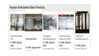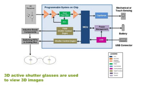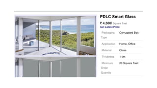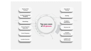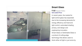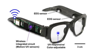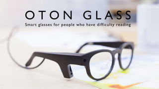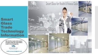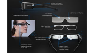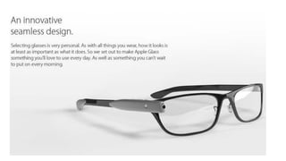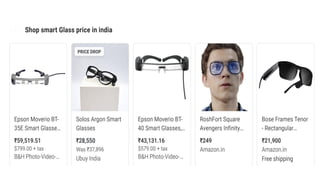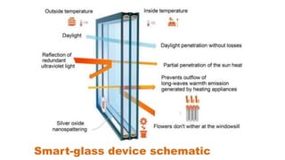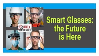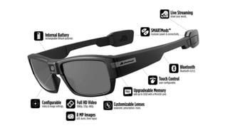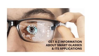 Smart glasses use augmented reality technology to provide life monitoring services and allow users to take authentic video and photos. The glasses can control light like infrared and ultraviolet using electricity, allowing the glass to switch from opaque to transparent. Opticians and eyeglass businesses need to be prepared to understand, assist with, and sell smart glasses within the next 5-7 years as the technology develops further.