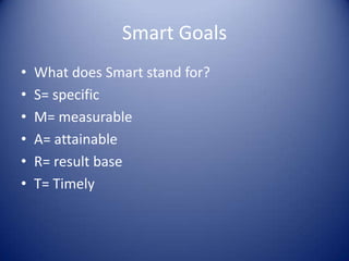 It provides examples to illustrate each component. SMART goals help people and businesses set realistic and achievable goals that keep them organized, committed, and able to track progress over a defined period of time.