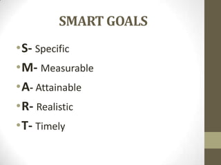 The document outlines a student's SMART goal to go to the gym at least 3 times per week. It discusses each element of a SMART goal: specific, measurable, attainable, realistic, and timely. The student's goal is to lift weights 3 times a week, track gym visits in a journal, and continue working out through the semester. Factors like friends' encouragement, free access to campus gym, and healthy eating habits at home will help the student achieve this goal. An update shows the student exceeded the goal by going to the gym more than 3 times per week.