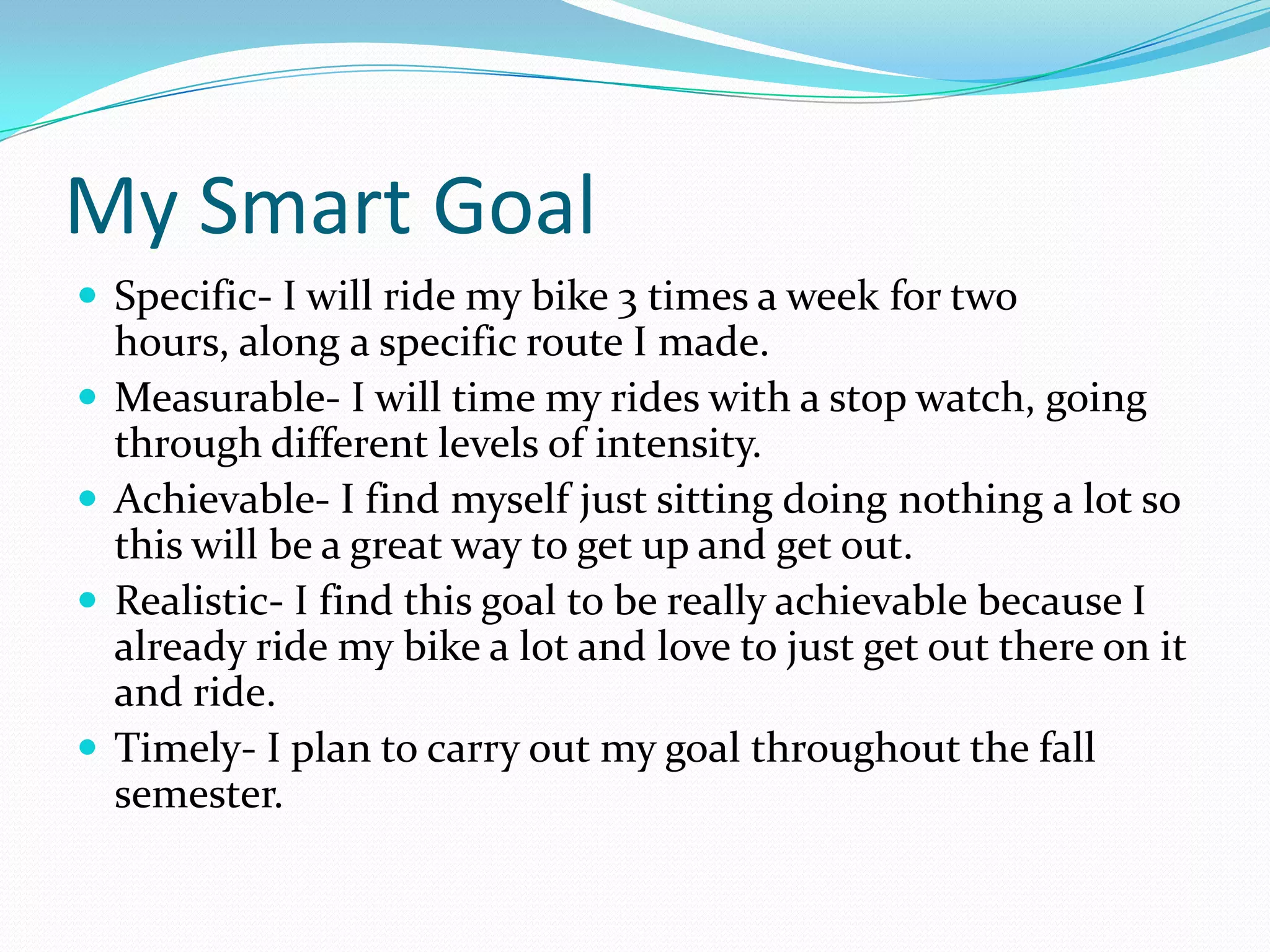 Shane created a smart goal to ride his bike 3 times a week for 2 hours along a specific route. He tracked his progress in a log and found that completing the goal helped him be more active and less sedentary. Though he missed a few rides, he made up for it with hikes. Setting clear goals and sharing them with friends helped Shane stay motivated and achieve his intended outcome of increased exercise.