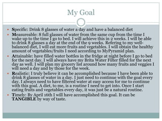 Danielle Bennett created a SMART goal to drink 8 glasses of water per day and eat a balanced diet. She was able to achieve drinking 8 glasses of water per day within 2 weeks by keeping track of her water intake and having water easily accessible. Eating a balanced diet was more difficult to maintain due to time constraints and lack of motivation, though she was initially able to keep a balanced diet for a few weeks. Support from her roommate and family helped motivate her to achieve her water drinking goal.
