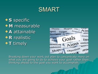 3) The goal is attainable and realistic given Lauren's previous running experience and access to a gym near her home. Four weeks provides enough time to safely lose 2 pounds per week to reach the 10 pound goal.