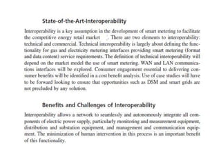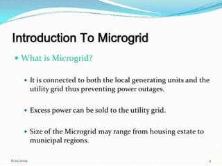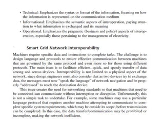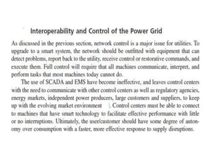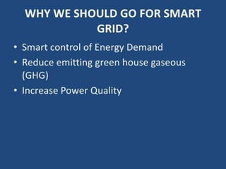 A smart grid uses digital technology and automation to detect and react to local changes in usage. It incorporates smart meters, renewable energy sources, and energy efficiency resources. The Government of India approved the National Smart Grid Mission to plan and monitor smart grid policies and programs. The NSGM will have its own resources and autonomy. It aims to deploy smart meters and substations, develop distributed generation like rooftop solar, and create infrastructure like EV charging stations.