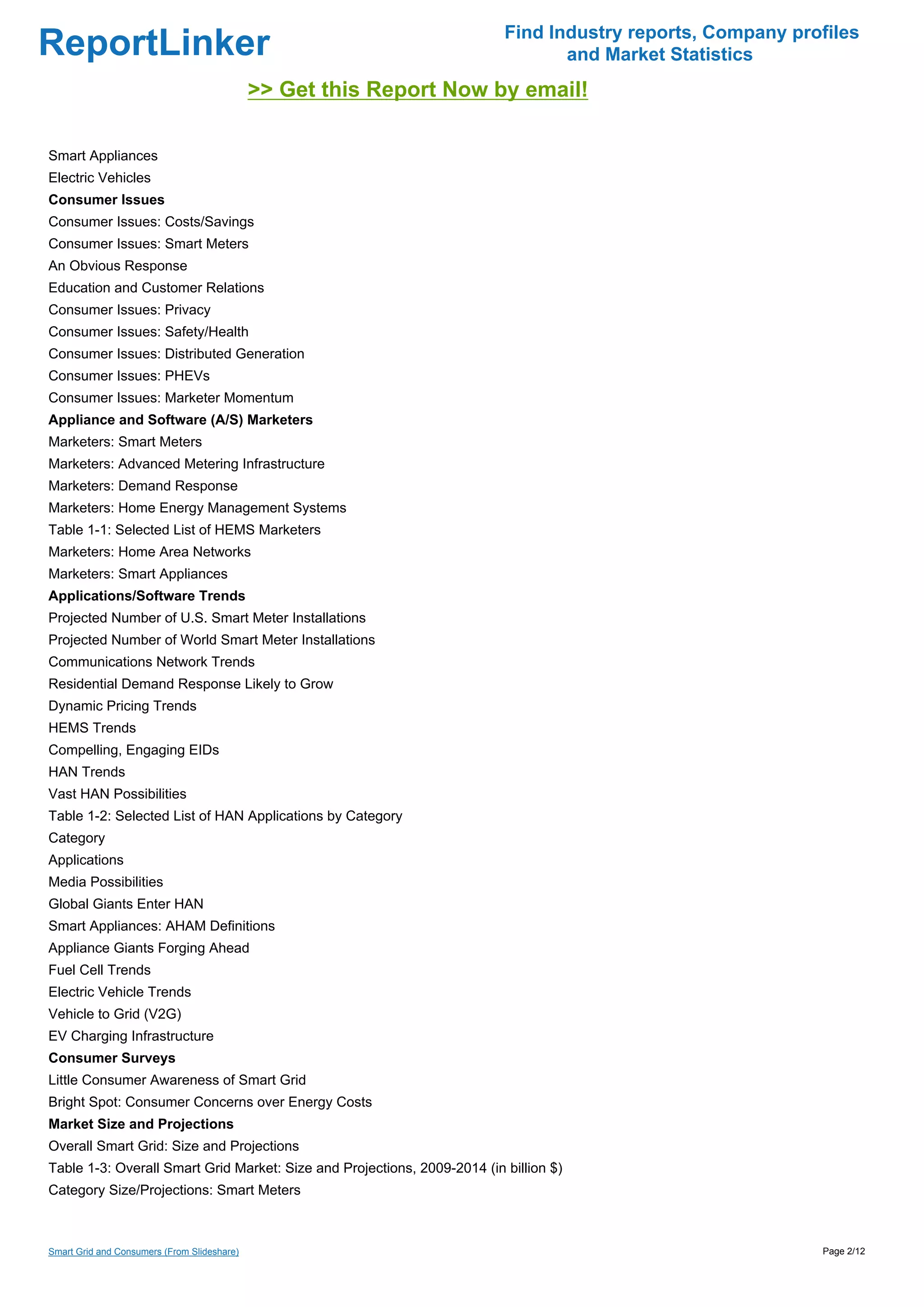 The document summarizes a report on the smart grid and consumers. It finds that while the smart grid aims to establish two-way communication between utilities and consumers, consumer applications have lagged behind. Early smart meter rollouts faced consumer resistance over costs and privacy issues. Surveys show consumers are open to energy management technologies but unwilling to pay much for them. The market for smart grid consumer applications is projected to grow to over $70 billion globally by 2014, but this depends on overcoming challenges in consumer acceptance and engagement.