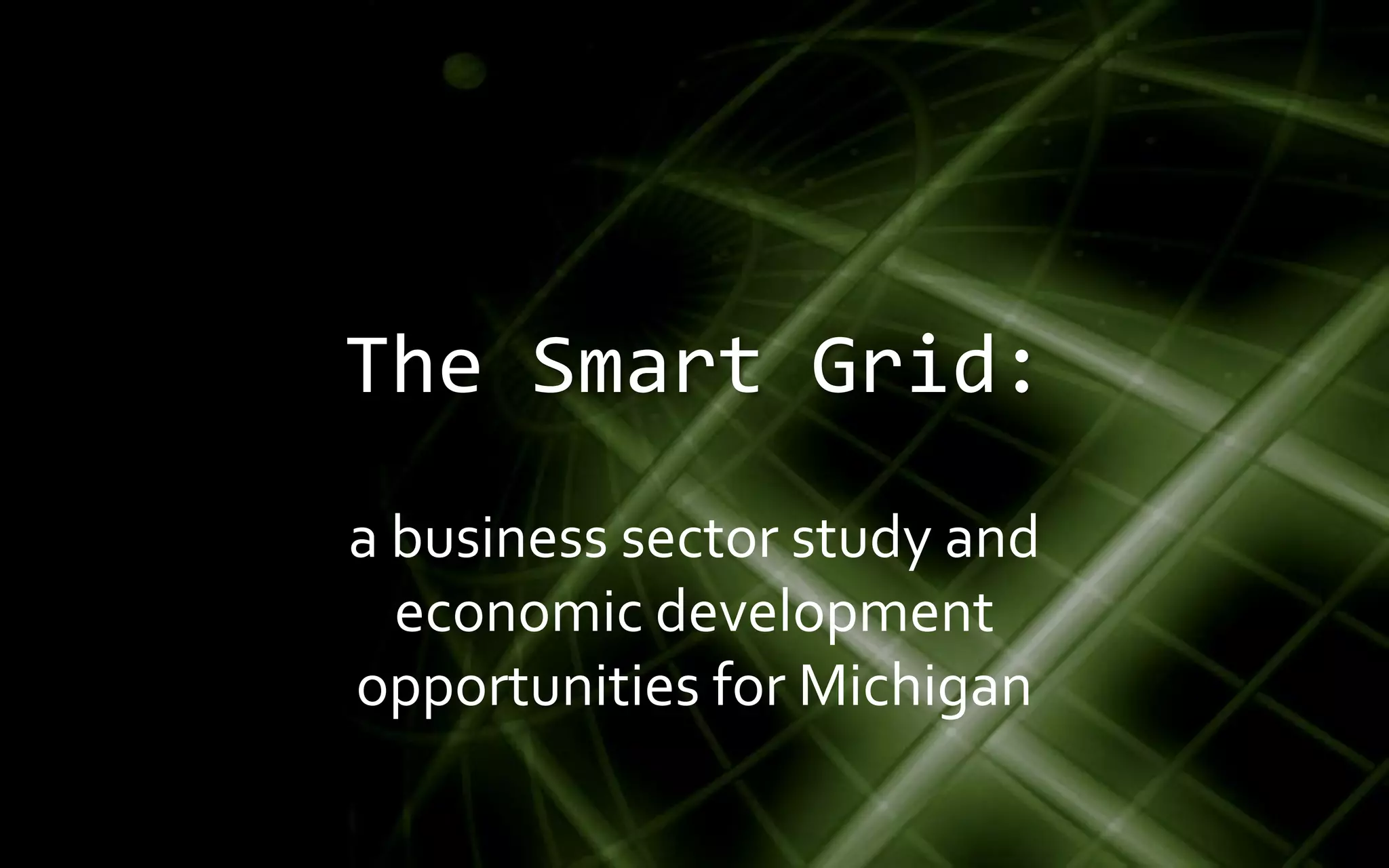 The document discusses the development of a smart grid in Michigan and its potential economic benefits, including job creation and enhanced energy efficiency through advanced technologies. It outlines the characteristics of the smart grid, its applications in consumer participation, and the role of key companies and public policies in fostering innovation in energy supply and management. It also highlights Michigan's initiatives, investment opportunities, and recommendations for workforce development in the smart grid sector.