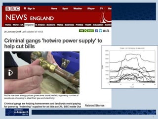 This document discusses smart grids, smart metering, and cybersecurity. It describes how smart grids use high-speed communication systems and distributed computing for service restoration, voltage control, condition monitoring and other functions. It also discusses using cloud computing and trusted computing paradigms to securely share critical infrastructure data in real-time between transmission and distribution network operators. Finally, it describes how analytics on domestic load profiles could help detect energy theft at scale.