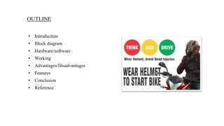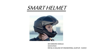 The smart helmet system uses sensors and modules to enhance rider safety. It includes an alcohol sensor to prevent riding if intoxicated, GPS and GSM modules to track location and send alerts if an accident is detected, a temperature sensor and fan to regulate internal temperature, and a vibration sensor to detect accidents. The system aims to automatically respond to risks and send alerts to reduce accidents and save lives. It links the helmet to the bike ignition to prevent starting without a helmet.