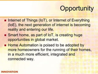 The document describes MiseTech's SPIDER home automation solution. SPIDER allows homeowners to control all smart home applications from a universal controller and customize their system by adding or removing applications. It provides benefits like reduced costs, enhanced safety, and more convenient living. The global smart home market is expected to reach $51.77 billion by 2020, representing an opportunity for MiseTech to succeed with SPIDER. The company is seeking funding to develop SPIDER over the next 12 months.