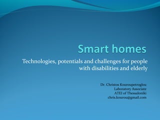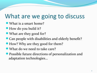 This document discusses smart homes and their potential benefits for people with disabilities and the elderly. It begins by defining smart homes as houses equipped with automated systems that can be remotely controlled. It then outlines the main components of smart homes, including sensors, devices, networks, and control mechanisms. The document explains how smart home applications could provide health monitoring, safety, communication, and entertainment services for those with disabilities or elderly. However, it also notes technological challenges around fragmentation, communication, and human factors like design, ease of use, and privacy. Overall, the document advocates for placing people's needs first and developing personalized and adaptive technologies to meet the needs of all users.