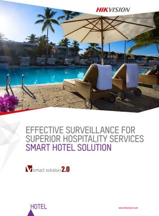 This document summarizes the Hikvision Smart Solution for Hotels, a complete IP surveillance system. The system provides 24/7 protection with low-light cameras, automated vehicle access control using ANPR, and automatic event alerts. It includes IP cameras, NVRs, and video management software to create a reliable, flexible security platform. The system improves safety, vehicle management, decreases intrusiveness, and provides reliable footage for investigations.