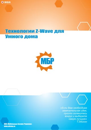 Буклет посвящён технологиям Z-Wave для умного дома, предлагающим доступные и функциональные решения для автоматизации различных процессов, таких как управление освещением, отоплением и системой безопасности. Основное внимание уделено беспроводным технологиям, позволяющим контролировать устройства через смартфоны и планшеты, что делает их менее зависимыми от проводных систем. Также представлены ориентировочные цены на оборудование, подтверждающие доступность решений для широкой аудитории потребителей.