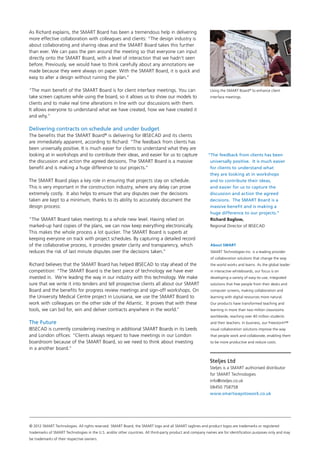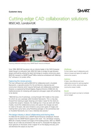 IBSECAD is a CAD coordination company that helps clients visualize construction projects. They were using traditional projectors and paper to collaborate, but wanted a faster way to review 3D models, record discussions, and make changes. IBSECAD invested in a SMART Board interactive whiteboard, allowing all meeting participants to directly annotate models in real-time. Clients and IBSECAD can now easily understand and contribute to project discussions. Using the SMART Board helps keep projects on schedule and reduces disputes by accurately documenting design decisions. IBSECAD believes the SMART Board gives them a competitive advantage in their industry.