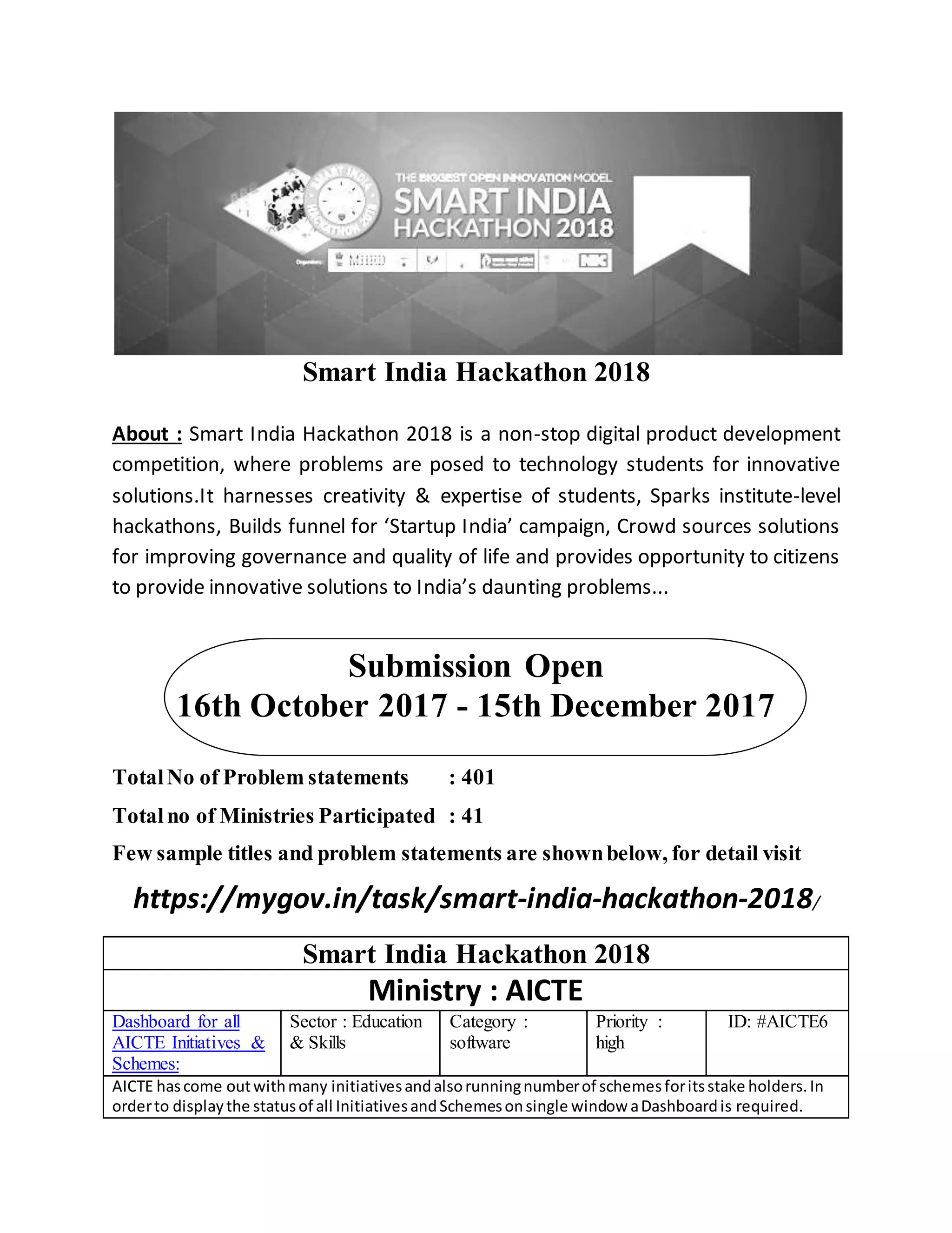 Smart India Hackathon 2018 is a digital product development competition that provides problems posed by the government for technology students to develop innovative solutions. It aims to harness students' creativity and expertise, spark institute-level hackathons, support the Startup India initiative, crowdsource solutions to improve governance and quality of life, and allow citizens to provide innovative solutions to India's challenges. The hackathon invites submissions for over 400 problem statements across 41 participating ministries covering areas like education, skills, governance, infrastructure, agriculture, automobiles, health, and security. Some example problem statements include developing a dashboard to display all initiatives of the AICTE, a tool to extract and edit information from scanned documents, and a mobile app for the Sans