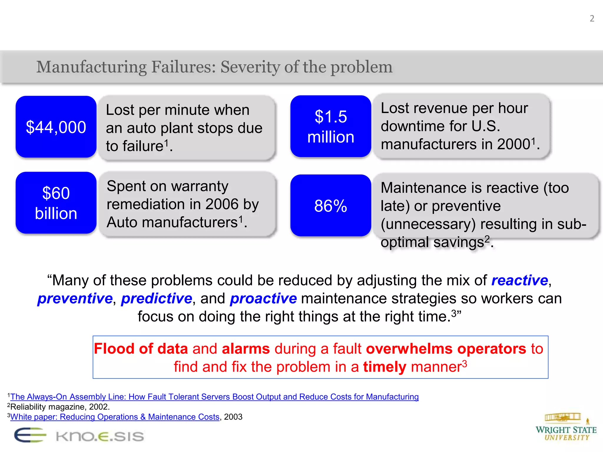 The document discusses the integration of Smart IoT in connected manufacturing, highlighting its role in addressing maintenance challenges and data interoperability. It emphasizes the need for improved maintenance strategies and actionable information synthesis from diverse data sources to boost manufacturing efficiency. The presentation is based on the advances in sensor technology, data analytics, and cognitive computing aimed at enhancing manufacturing processes.
