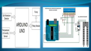 The document discusses an IoT-based smart irrigation system designed for efficient agricultural practices in India, addressing the increased need for agricultural production due to rising population. It outlines the system's hardware components, such as Arduino and soil moisture sensors, and software functionalities that automate irrigation based on real-time environmental data. The study emphasizes the advantages of this technology in saving time, money, and resources, while also suggesting future applications beyond irrigation, such as cattle management and climate control.
