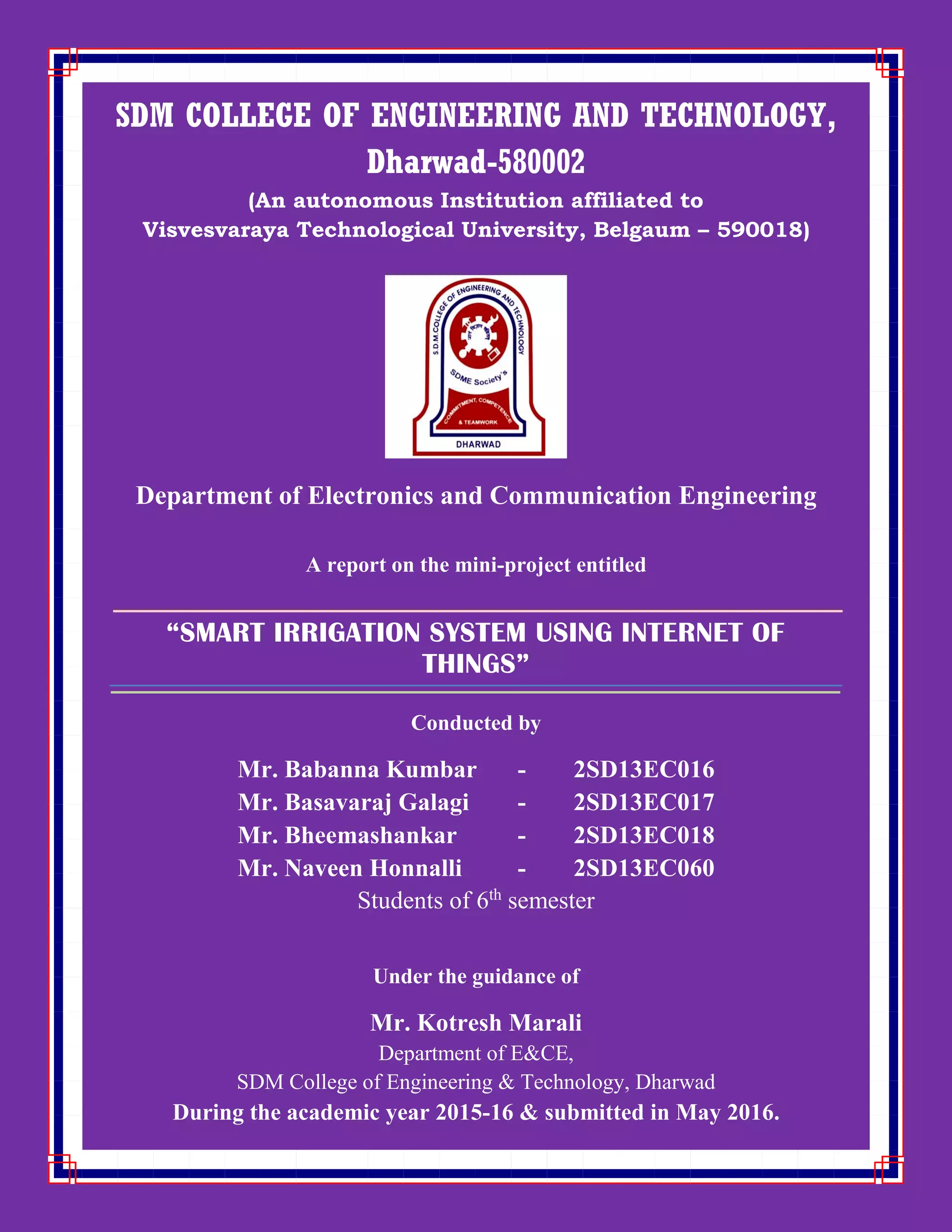 This document describes a smart irrigation system project conducted by four students at SDM College of Engineering and Technology in Dharwad, India. The project aims to develop a smart irrigation system using Internet of Things technology. It was conducted during the 2015-2016 academic year under the guidance of a professor in the Electronics and Communication Engineering department. The report documents the system developed and results obtained from the project.