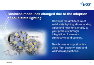 The document discusses enhancing lighting with new functionalities and low cost connectivity. It describes how the adoption of solid state lighting has changed business models and created new opportunities through integrating wireless connectivity and sensors. It outlines VTT's expertise in areas like wireless technologies, measurement systems, and practical lighting knowledge that can help overcome challenges of connectivity, functionality, and integration for smart lighting applications.