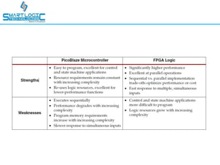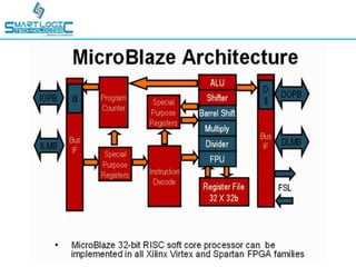 This document provides an overview of processor IP cores in FPGAs. It discusses what an FPGA is and its main components like configurable logic blocks and input/output blocks. It then compares microcontrollers to FPGAs and describes different types of intellectual properties that can be used, including soft IP like counters and hard IP like block RAM. It also discusses using processors like Picoblaze and Microblaze in FPGAs and provides information on their architecture and usage. Finally, it mentions the presenter's contact information for any further questions.