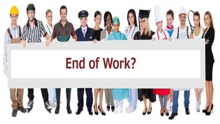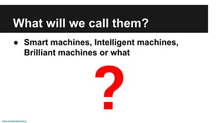 The document discusses the emergence and implications of smart machines, highlighting their reliance on existing technologies such as cloud computing and big data. It outlines various phases of innovation driven by these machines, which range from altering current industries to creating new ones. Additionally, it addresses potential impacts on employment, suggesting that a significant portion of jobs could be at risk due to automation.