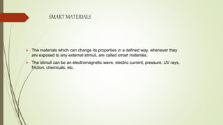 Smart materials can change their properties in response to external stimuli like heat, pressure, and electric fields, making them useful in industries such as electronics and construction. They are classified into active and passive types, with active materials able to modify their properties under certain conditions. While they offer advantages like high performance and adaptability, smart materials made from polymers may have drawbacks including weak mechanical strength and long response times.
