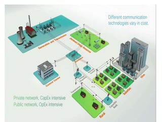 The document outlines the architectural and communication technologies for smart metering within electric utility systems, detailing the interactions between smart meters, collectors, and various communication networks like neighborhood area networks (NANs) and home area networks (HANs). It examines the benefits and challenges of different wireless protocols including Zigbee, Z-Wave, Wi-Fi, and LTE, as well as power line communications, highlighting their applications in load control and demand management. Additionally, it discusses security and privacy concerns, analytics requirements, and the importance of robust communication infrastructure to support the growing complexities of smart grids.