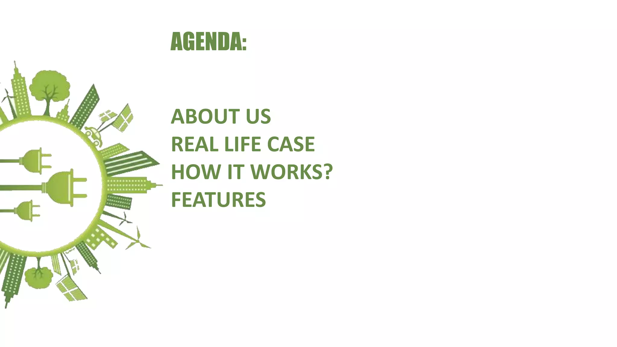 The document outlines strategies for increasing energy efficiency through a cloud-based platform that connects devices and facilitates data-driven decision-making. It presents real-life case studies showcasing significant potential energy savings, including methods like smart metering and temperature control. Key features include real-time consumption monitoring, automatic reporting, and integration with various sensors and devices.