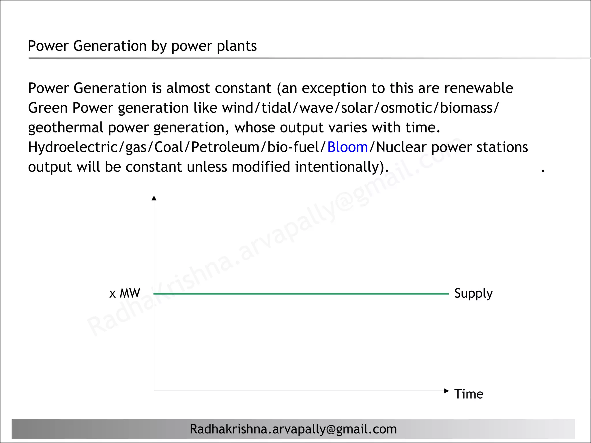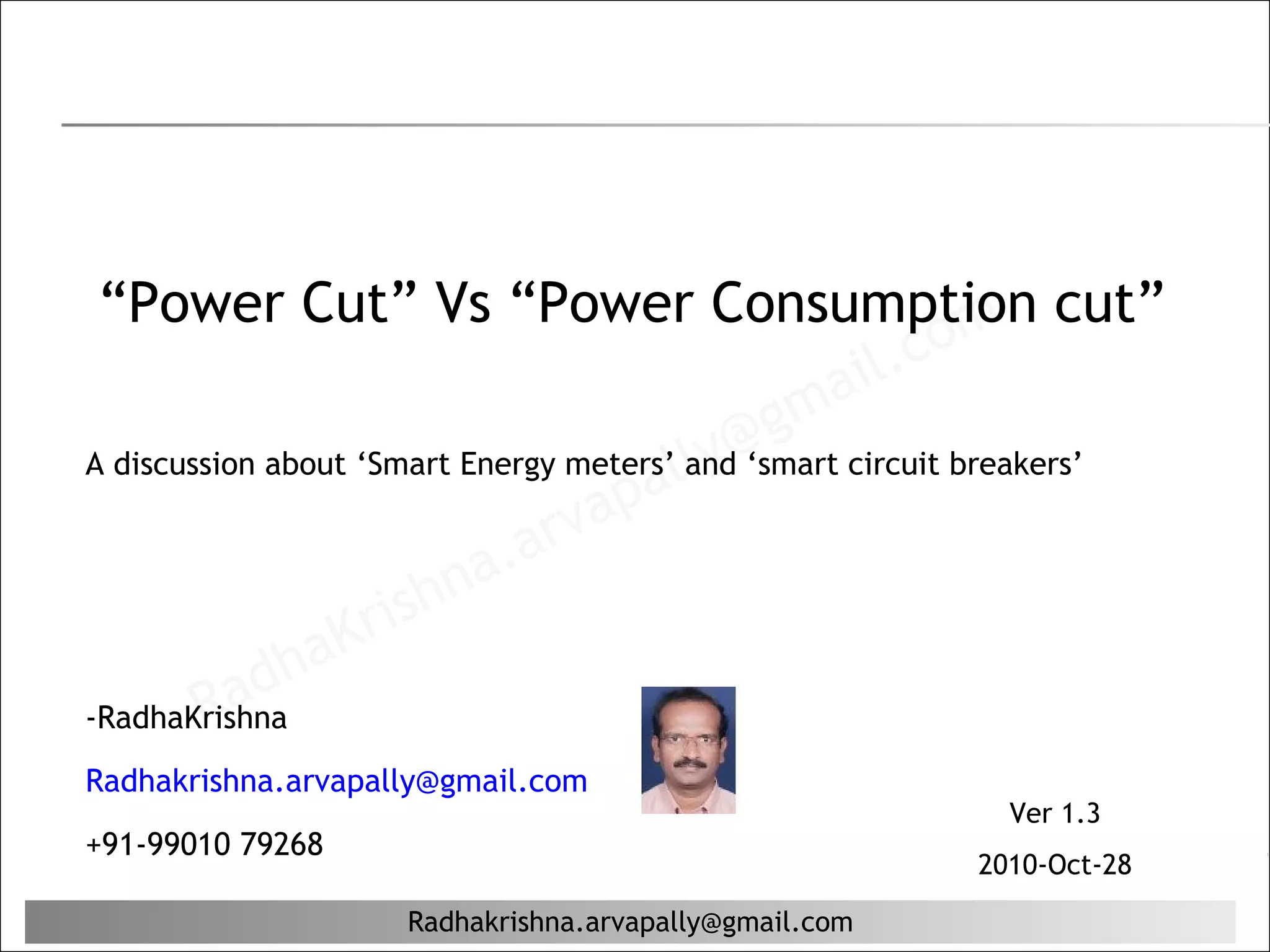 The document discusses power generation, consumption, and solutions to mismatches between supply and demand. It notes that power generation is mostly constant while consumption fluctuates. This can lead distribution companies to institute power cuts in some areas during peak hours. It proposes using smart meters to charge higher rates during peaks, incentivizing consumers to reduce non-priority usage and alleviating the need for power cuts. This would help match supply and demand better while reducing costs for consumers who have relied on expensive backup generators or inverters during outages.