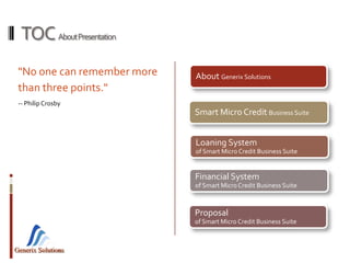 Generix Solutions provides the Smart Micro Credit Business Suite, which includes a loaning system, financial system, and proposal system. The loaning system allows for centralized application, tracking of clients between branches, and recovery solutions. The financial system enables branch-level accounting and integrated cost center analysis. Generix Solutions offers comprehensive features for these systems, including definitions, approvals, disbursements, reporting and more. Their proposal system considers financial costs based on an organization's needs for customization, reporting, size and training.