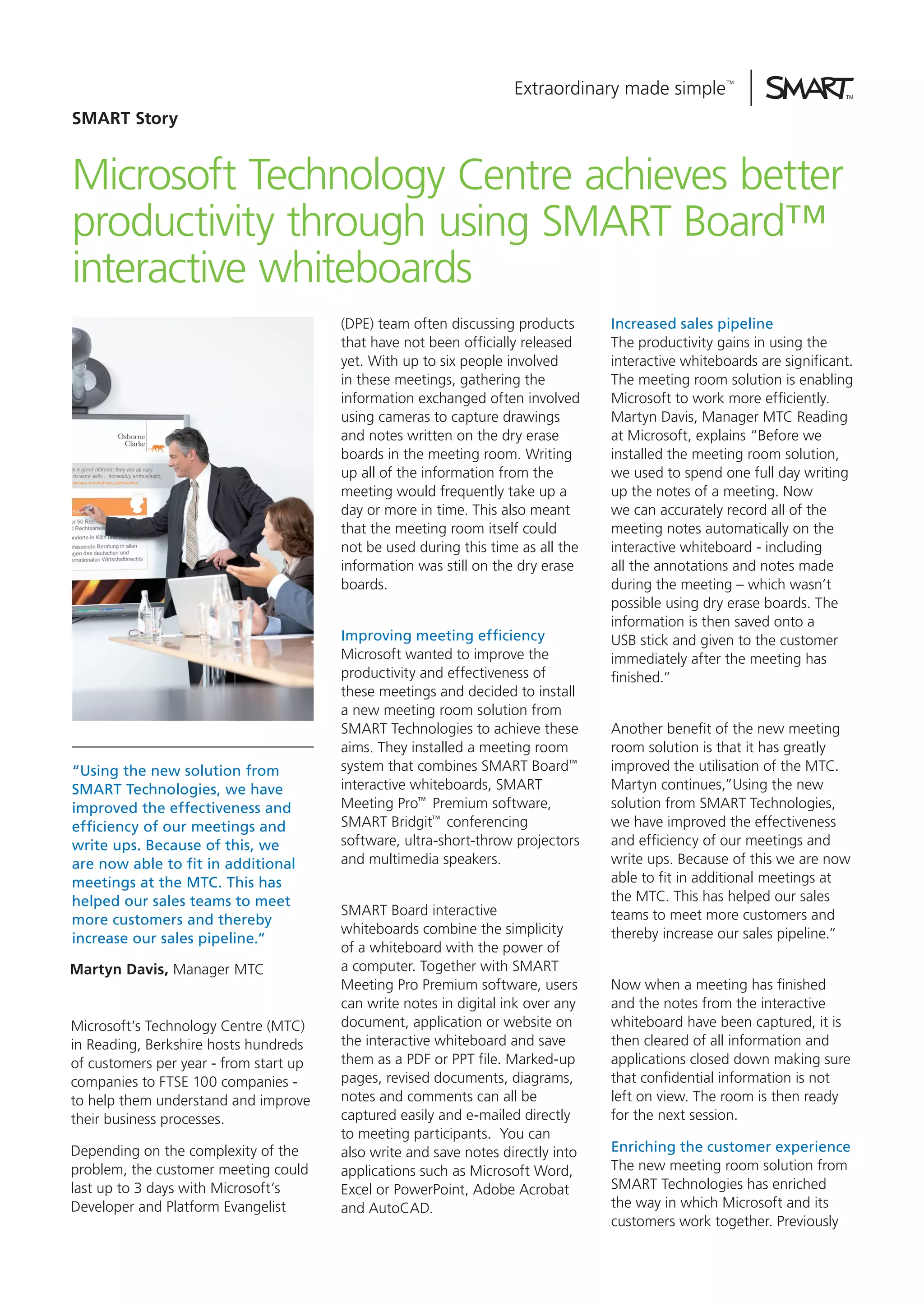 Microsoft's Technology Centre installed a new meeting room solution from SMART Technologies to improve productivity. The solution incorporates SMART Board interactive whiteboards, software, and conferencing tools. It allows meetings to automatically capture notes digitally rather than spending days writing them up. As a result, Microsoft can fit in more meetings and increase their sales pipeline. Customers also feel more actively involved in richer collaborative discussions.