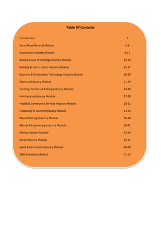 This document contains multiple choice questions from the General and Industry Modules of the WorkSafe SmartMove certificate. It includes an introduction noting that the answers are not published or available upon request. The document then provides sample questions from the General Module on topics like WHS laws, rights and responsibilities, hazards, incidents, and bullying. It also includes sample questions specific to industries like automotive, beauty, building and construction, and more. The questions cover identifying hazards, controlling risks, emergency procedures, and compliance with WHS regulations.